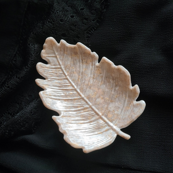 Deze tray in de vorm van een blad wordt door ons handgemaakt en bewerkt met stukjes bladgoud.
